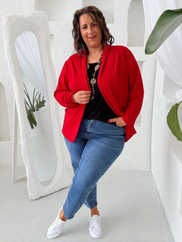 Naše modelka Zlatka (světle hnědé vlasy, mikádo) má pro představu míry: prsa - 124cm, pas - 104cm, boky - 134cm, stehno - 66cm, paže - 34cm. Má na sobě větší verzi této halenky.